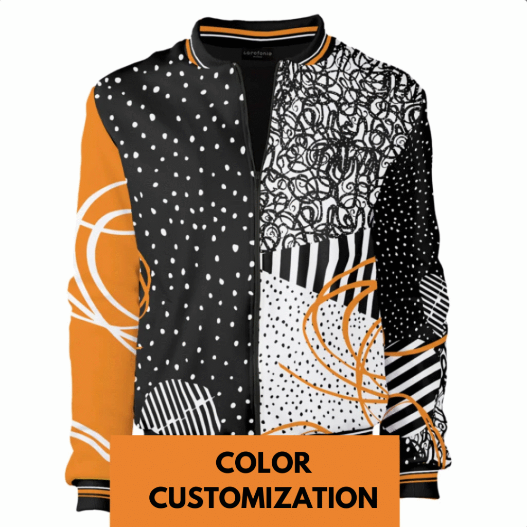 Our Dots and Lines bomber jacket showcases a captivating design of dots and lines, with geometric patterns that stand out. This bomber jacket comes with patterned ribbed cuffs, a front zipper, and two exterior pockets. The interior is lined with a sleek black fabric and features a small pocket for essentials.