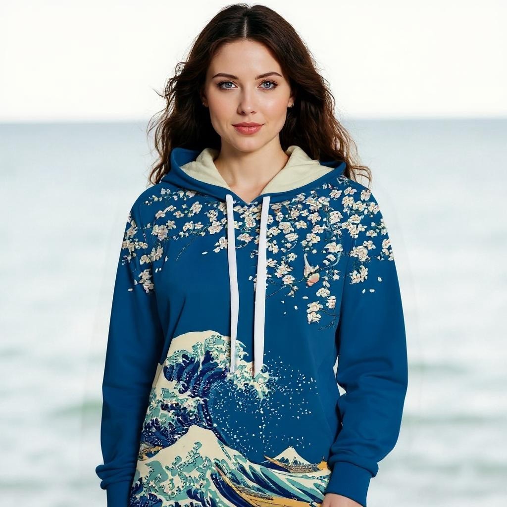 Soft in touch, hoodie, inspired by the art of Japanese artist Hokusai Katsushika. The world-famous wave was formed around 1831 as the first work of the series “36 Views of Mount Fuji.” We added little flowers to this pattern, and the author of these is also Hokusai Katsushika.