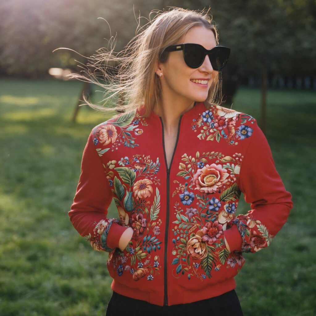 Czerwona bomberka w kwiatowy wzór to wyjątkowa kurtka, która doda charakteru każdej stylizacji. Wyrazisty, florystyczny motyw na czerwonym tle wygląda jak ręcznie haftowany, pełen detali i głębi. Kurtka ma czerwony zamek, wygodne kieszenie i czarną podszewkę, co sprawia, że jest nie tylko modna, ale i praktyczna.