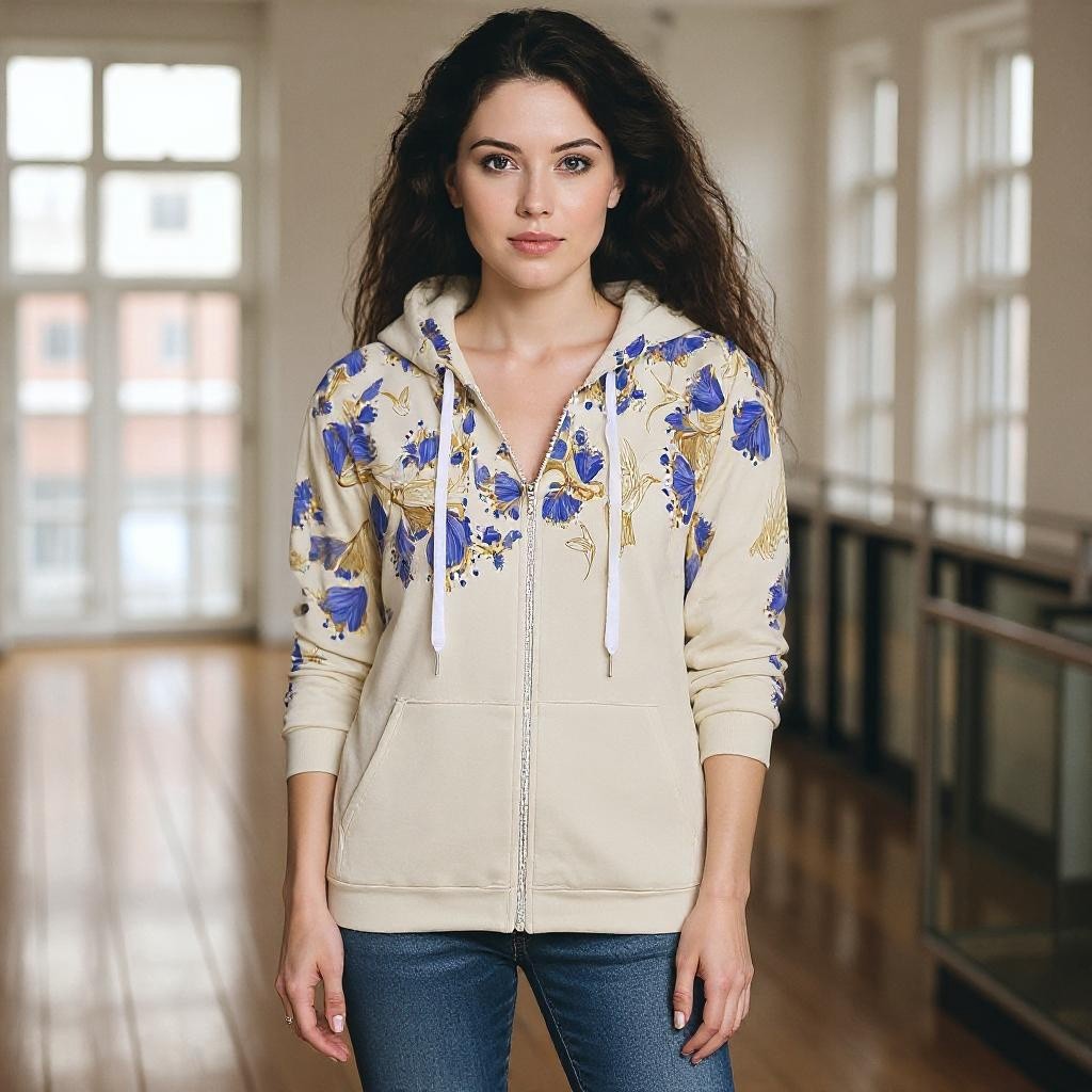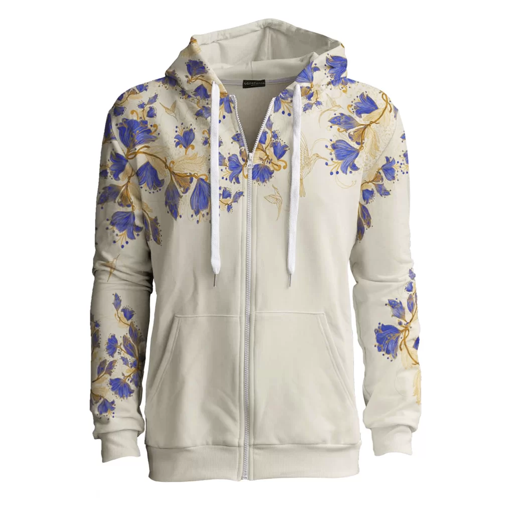Kremowa bluza rozpinana Cacofonia z wzorem Delicate Vanilla to oryginalna bluza z kapturem w delikatny wzór. Chabrowe kwiaty i złote kolibry to wyjątkowe połączenie. Kolorowa bluza rozpinana ma dwie wygodne kieszenie oraz kaptur z białym sznurkiem i biały suwak.