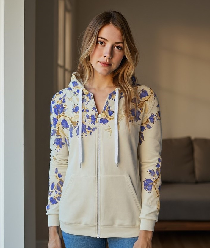 Bluza od wewnętrznej strony ma miły, bawełniany meszek, a z zewnętrznej wyjątkowy wzór. Nasze bluzy rozpinane z kapturem to krój unisex. Wzór Delicate Vanilla została wykonany ręcznie przy pomocy cienkopisów. Kolory i część detali powstały przy wsparciu komputera i tabletu graficznego. Autorką wzoru jest Joanna Podkowa, absolwentka Akademii Sztuk Pięknych w Łodzi.