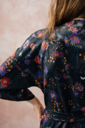 Przy tworzeniu wzoru autorka Joanna Podkowa inspirowała się kwiatami, które zebrała na polskiej łące. I jak to na łące, każdy kwiat jest zupełnie inny, malowany na wykroju koszulki jak na płótnie.