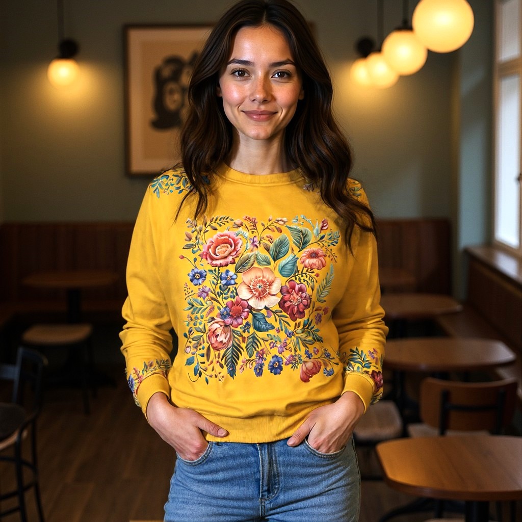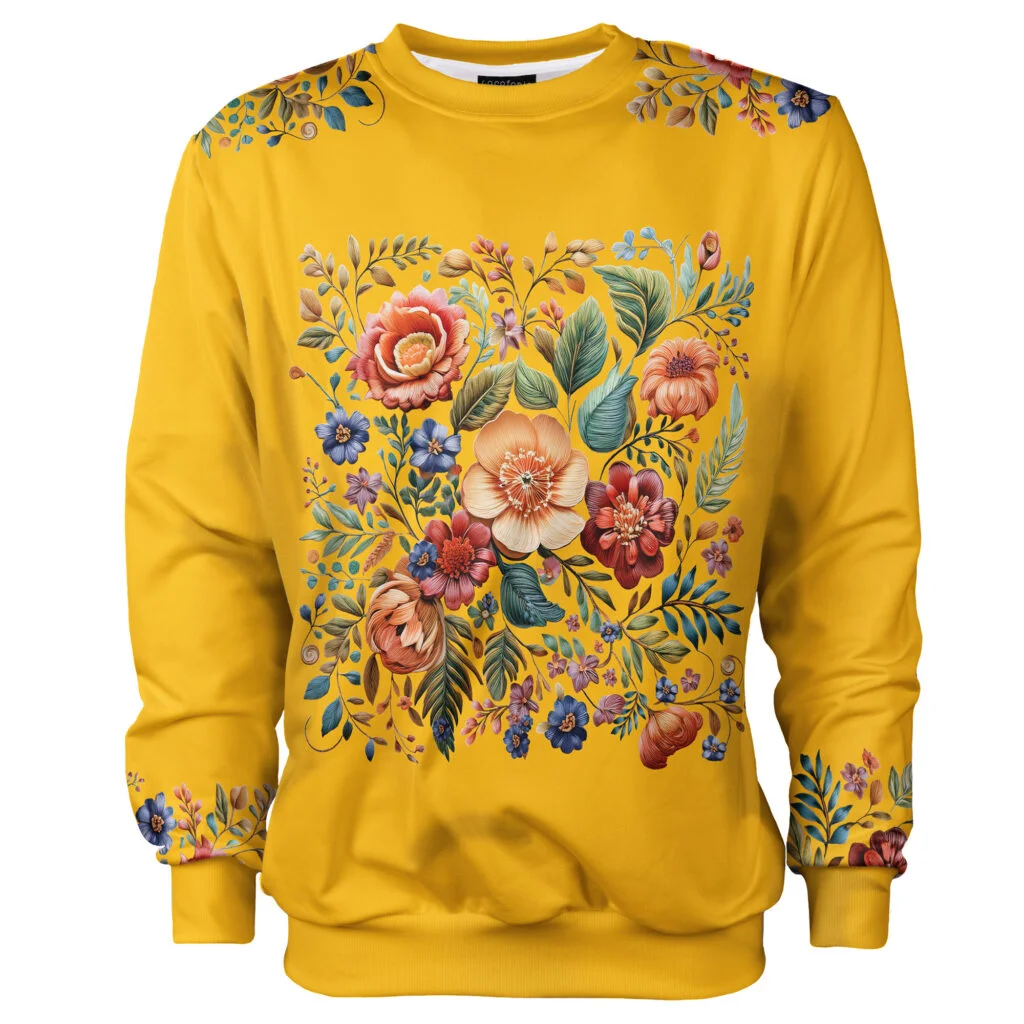 Komfortowa w noszeniu bluza bez kaptura od Cacofonia to wyjątkowy, żółty element garderoby o delikatnym wzorze Modern Flowers Yellow przypominającym haft. Bluza prosta w kwiaty posiada żółte ściągacze.