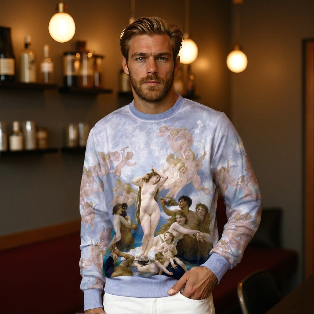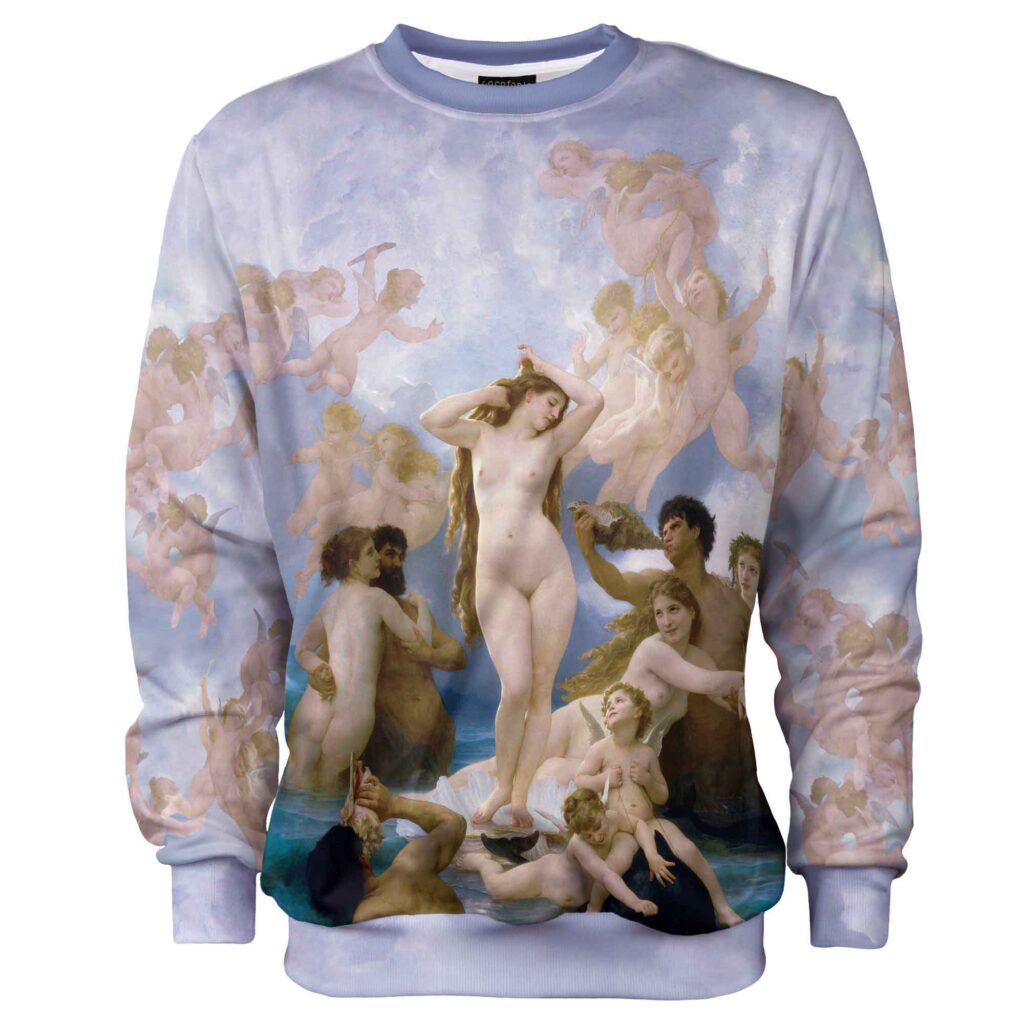 Liliowa bluza bez kaptura. Fioletowa bluza ze wzorem Violet Angels, inspirowanym obrazem Narodziny Venus autorstwa Williama-Adolphe’a Bouguereau.