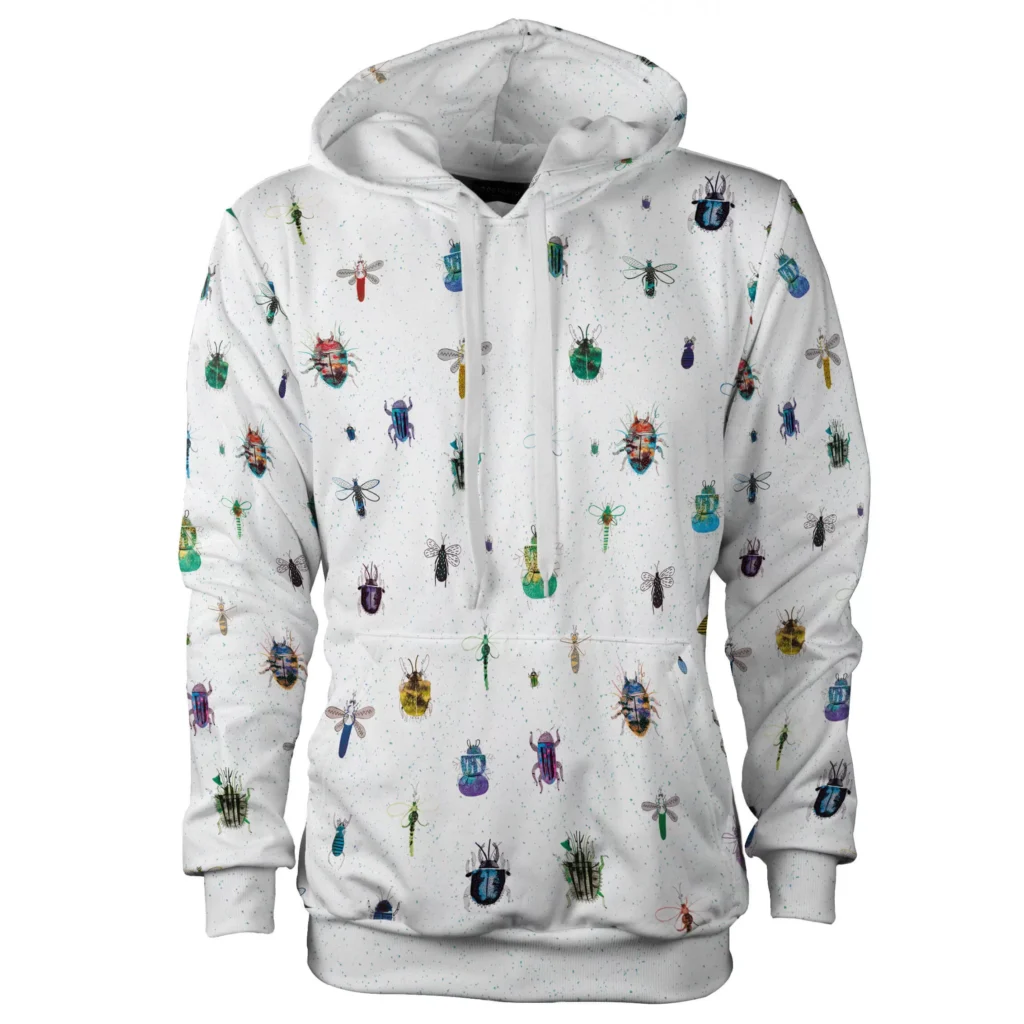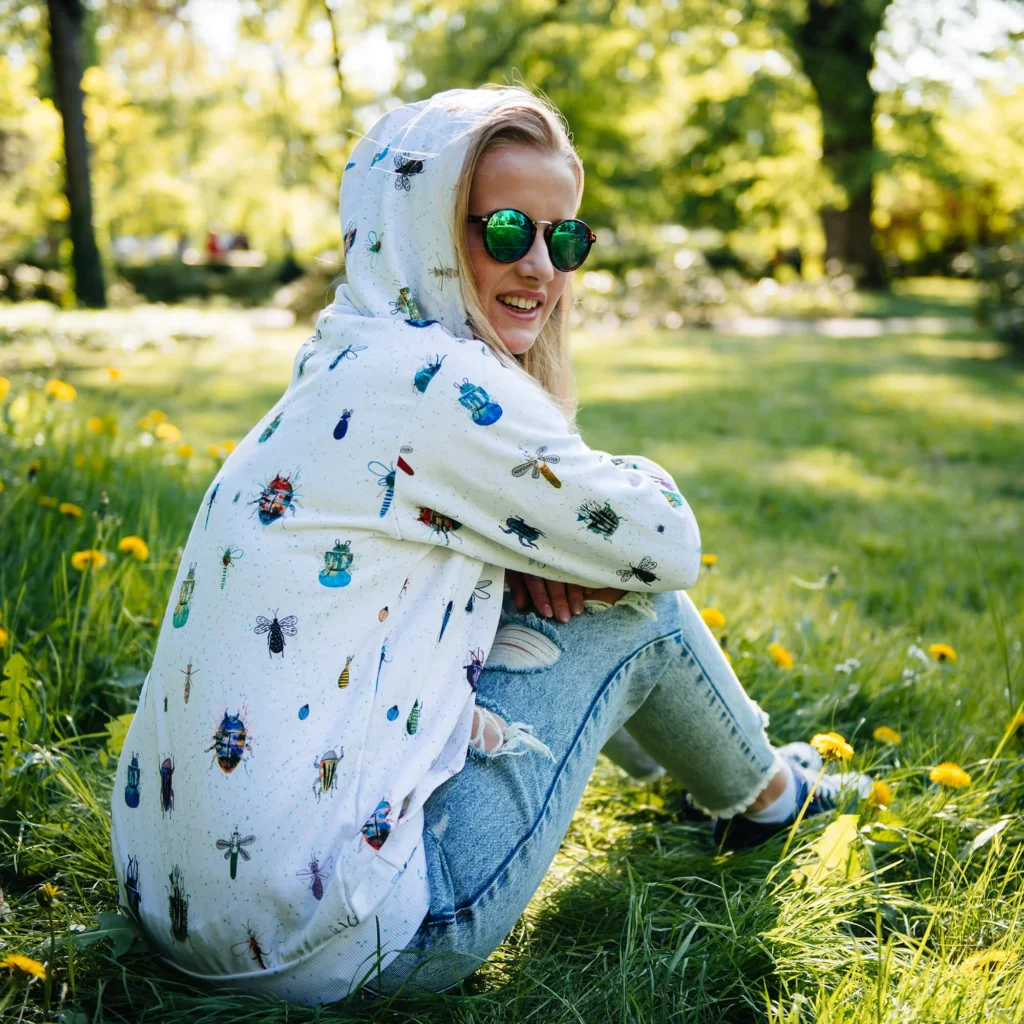 Miła w dotyku, biała bluza we wzory z kolorowymi, bajkowymi owadami. Autorką wzoru White Grassland jest Aga Głód, młoda artystka z Akademii Sztuk Pięknych. Bajkowe żuczki i inne owady zostały ręcznie namalowane farbami przez Agę, a następnie przeniesione na nasze ubrania.